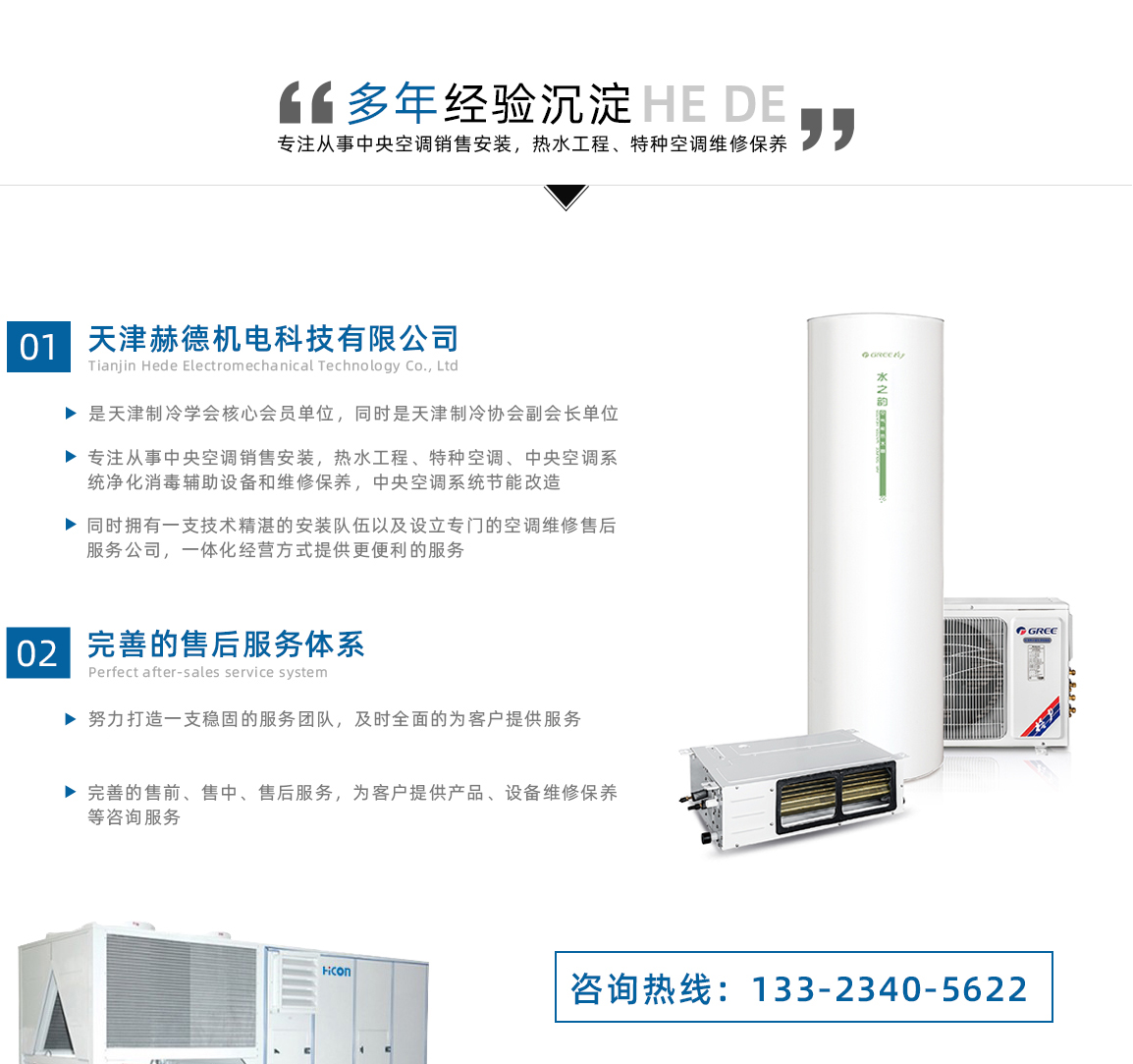 天津赫德機電科技有限公司是天津制冷學會會員單位,同時是天津制冷協會副會長單位,位于天津市海泰經濟區,依托天津制冷學會團隊資源從事中央空調銷售安裝,熱水工程、特種空調、中央空調系統凈化消毒輔助設備和維修保養,中央空調系統節能改造。赫德機電致力于綠色建筑暖通,低能耗解決用戶冷暖,全心全意為用戶負責,讓大地更綠天空更藍。企業服務宗旨:做綠色建筑暖通,低能耗解決用戶冷暖,全心全意為用戶負責,讓大地更綠天空更藍。